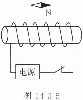 6. 闭合开关后,小磁针静止时的指向如图 14 - 3 - 5 所示,请标出电源的“+”“-”极和通电螺线管的 N、S 极,并画出通电螺线管外部通过小磁针中心的磁感线。