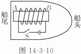 4. 小明自制了一个带有通电螺线管的木船模型,将它放入水中后漂浮,如图 14 - 3 - 10 所示,闭合开关 S,A 端为