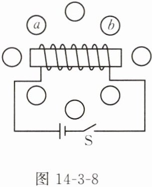 2. 图 14 - 3 - 8 是小聪探究通电螺线管的磁场方向时的实验示意图。实验时,在小圆位置放置小磁针,闭合开关 S,画出不同位置小磁针静止时 N 极的指向;对调电源的正、负极,重复上述操作。下列说法不正确的是(