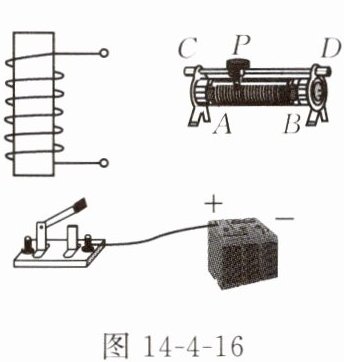 10. 如图 14 - 4 - 16 所示,请用笔画线代替导线将图中的实物连接起来。要求:闭合开关后,通电螺线管的上端为 N 极;当滑动变阻器的滑动头 P 向左移动时,通电螺线管的磁性增强。
