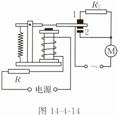 8. 小明去商场时发现能自动变速的电梯,图 14 - 4 - 14 为该电梯的简易控制电路,R 是一个力敏电阻,其阻值随所受压力的增大而减小。当有人站在电梯上时,电磁铁的磁性变