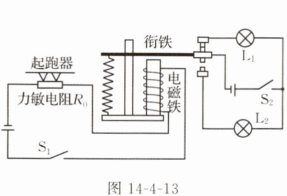 7. 图 14 - 4 - 13 是小彩设计的短跑比赛“抢跑判断器”,通电后,电磁铁的上端为