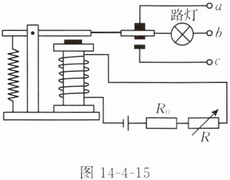 9. 如图 14 - 4 - 15 所示,R₀ 是一个光敏电阻,阻值随光照强度的增大而减小,R 是电阻箱(已调至合适阻值),它们和电磁继电器组成自动控制电路来控制路灯,白天灯熄,夜晚灯亮。给路灯供电的电源应接在