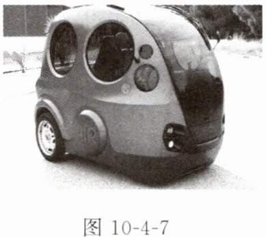 空气动力发动机汽车(如图 10-4-7 所示)是近些年科技发展的产物,它以高压压缩空气为动力源,将压缩空气存储的压力能转化为机械能,从而驱动汽车运行。空气动力发动机的工作冲程与传统内燃机的相似,但由于使用空气作为动力源,在气缸里没有高温高压气体的燃烧过程,只通过单纯的气体膨胀做功来达到功率输出的目的,因此不再需要复杂的冷却系统,机体也可以选用强度低、密度小的材料和简单的结构,所以结构简单、尺寸小、质量小、造价低。