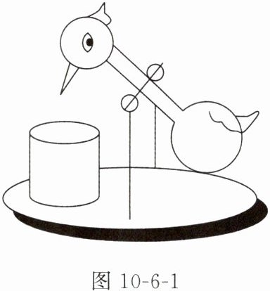 5. 中国古代玩具饮水鸟(如图 10-6-1 所示)的神奇之处在于:在鸟的面前放上一杯水,鸟就会俯下身去,把嘴浸到水里,“喝”了一口后,又直立起来;可是直立一会儿它又会俯下身去,等到鸟嘴浸到了水,“喝”了一口后,又会直立起来。饮水鸟这种“自动喝水”的现象