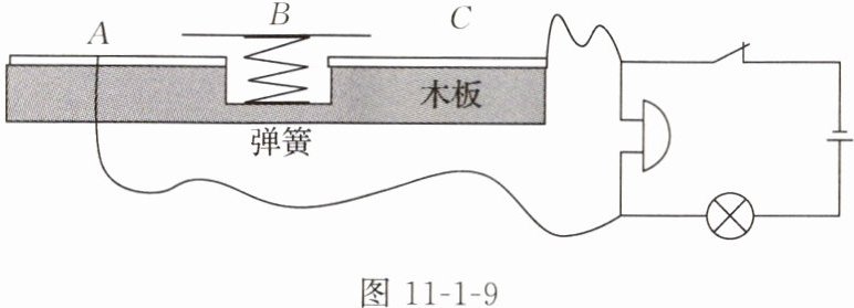 7. 图 11 - 1 - 9 是具有报警功能的文物展示台示意图,该展示台由木板、弹簧、金属片(A、B、C)和报警电路组成。当小偷把物品搬离展示台时,金属片 B 在弹簧弹力作用下与金属片 AC 分开,这时小灯泡