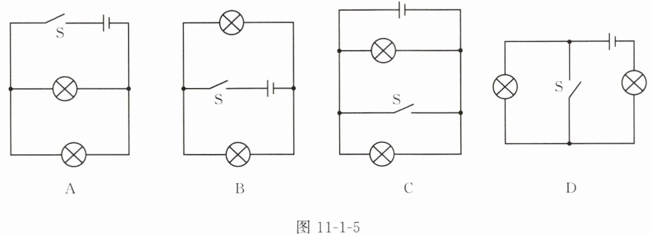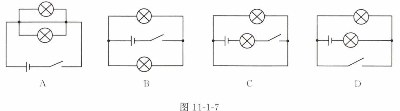 5. 实践课上,老师让同学们画出两个小灯泡连接在一个电路中并且都能正常发光的电路图,四位同学各自画出的电路图如图 11 - 1 - 7 所示,其中正确的是(