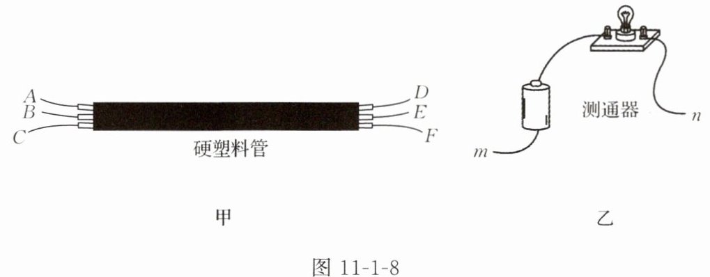 6. 如图 11 - 1 - 8 甲所示,一根电缆内穿有三根完全相同的电线,用如图 11 - 1 - 8 乙所示的测通器可辨别哪两个线头为同一根电线的两端。连接 A 和 C、将测通器的 m 接在 D 端,当 n 接 F 端时小灯泡发光,当 n 接 E 端时小灯泡不发光。由此可确定为同一导线两端的是(