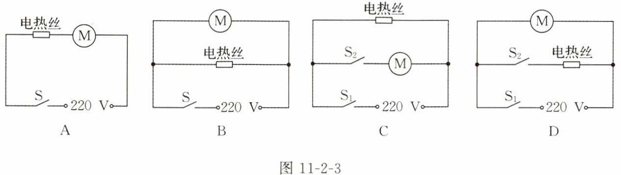 3. 家用电吹风机由电动机和电热丝等组成,当只有开关 $ S_1 $ 闭合时,可以吹冷风;当开关 $ S_1 $、$ S_2 $ 都闭合时,可以吹热风。如图 11 - 2 - 3 所示的电路图中符合要求的是(