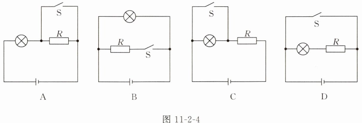 4. 为了安全,汽车行驶时驾驶员必须系好安全带。当系好安全带时,相当于闭合开关,指示灯不亮;未系好安全带时,相当于断开开关,指示灯发光。图 11 - 2 - 4 中符合上述要求的电路图是(