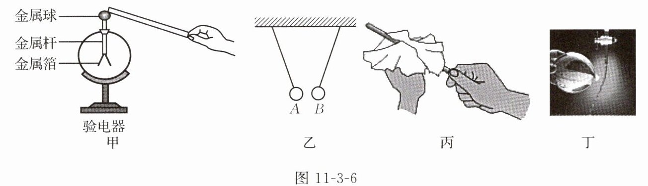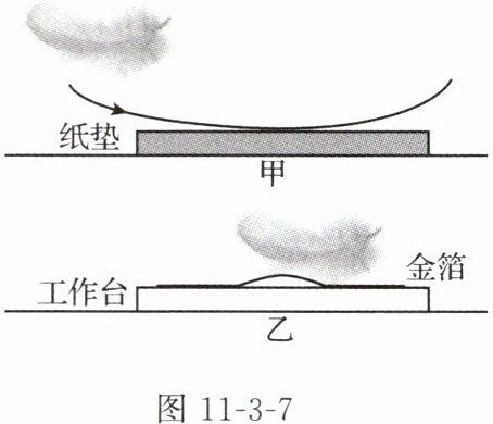 4. 南京金箔锻制技艺是南京地方传统手工技艺,国家级非物质文化遗产,有“中华一绝”之称。手工打造的金箔轻薄柔软,不能用手直接拿取,正确拿取的方法是:手持羽毛轻轻扫过纸垫(如图 11-3-7 甲所示),再将羽毛靠近工作台上方的金箔,羽毛即可将金箔吸住(如图 11-3-7 乙所示)。羽毛扫过纸垫时,摩擦使得羽毛和纸垫带上了