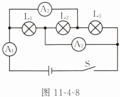 5. 如图 11 - 4 - 8 所示,开关 S 闭合后,电流表 A₁、A₂、A₃ 的示数分别为 1.0 A、0.8 A、0.5 A,则通过 L₁ 的电流是____A,通过 L₂ 的电流是A,通过 L₃ 的电流是A。