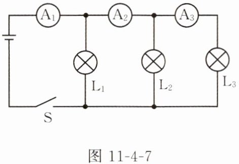 4. 如图 11 - 4 - 7 所示,当开关 S 闭合时,电流表 A₁、A₂、A₃ 的示数分别为 1.2 A、1.0 A、0.6 A,则通过 L₁ 的电流是