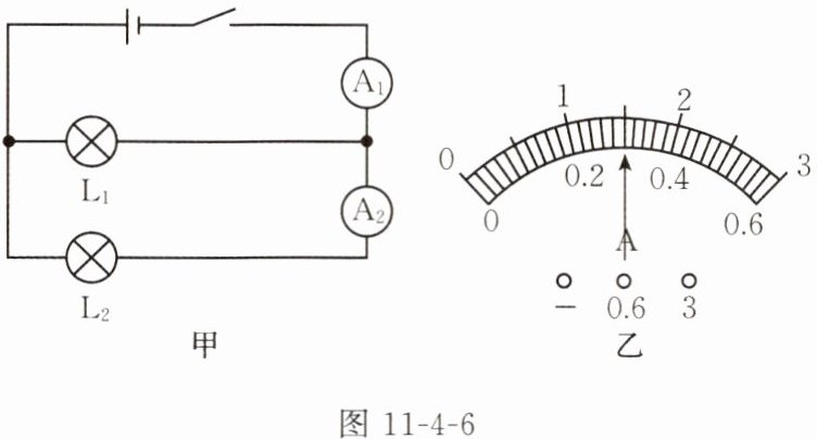 2. 如图 11 - 4 - 6 甲所示的电路中,电流表 A₁、A₂ 都有 0~0.6 A 和 0~3 A 两个量程。闭合开关后,两个电流表的指针偏转情况均如图 11 - 4 - 6 乙所示,则通过灯泡 L₁ 和 L₂ 的电流分别为(