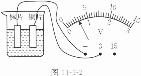 4. 如图 11 - 5 - 2 所示,在烧杯中加入盐水,然后将连在电压表上的铜片和锌片插入盐水中,这样就制成了一个盐水电池。观察电压表的接线情况和指针偏转情况可知:锌片是盐水电池的