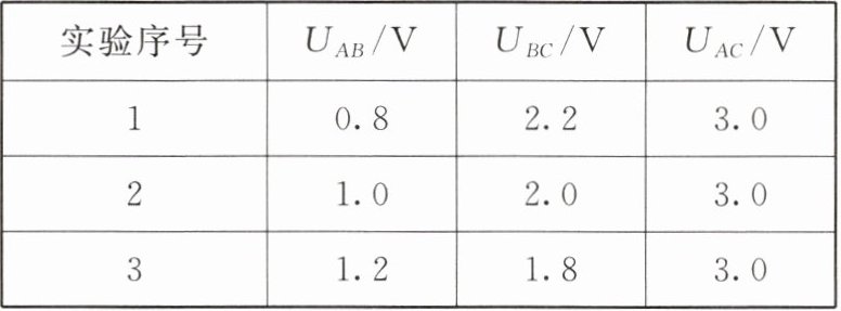 (2)用电压表分别测出 A 与 B、B 与 C、A 与 C 两点间的电压,记为$ U_{AB}、$$U_{BC}、$$U_{AC},$将得到的数据记录在下表中。通过分析实验数据,最终得出结论:串联电路