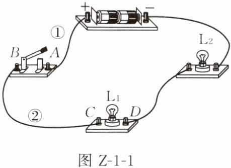 1. 如图 Z-1-1 所示,当开关闭合时,灯 $ L_1 $、$ L_2 $ 均不亮。为了查找电路故障,某同学用一根完好的导线,一端固定在电源正极,另一端依次接触 $ A $、$ B $、$ C $、$ D $ 四个接线柱,发现只有与 $ D $ 接线柱接触时小灯泡 $ L_2 $ 才发光,若电路只有一处断路,位置可能是(