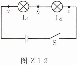 2. 利用如图 Z-1-2 所示的电路研究串联电路中的电压规律时,闭合开关 $ S $ 后,发现灯泡 $ L_1 $、$ L_2 $ 都不亮。小组同学用电压表判断电路故障:电压表并联在 $ a $、$ c $ 两点时有示数;电压表并联在 $ a $、$ b $ 两点时无示数;电压表并联在 $ b $、$ c $ 两点时有示数。电路故障可能是(