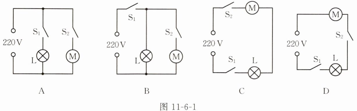 2. (2024·江苏无锡中考)电冰箱冷藏室中的照明灯 L 由门控开关 S₁ 控制,压缩机 M(电动机)由温控开关 S₂ 控制,要求照明灯 L 和压缩机 M 既能单独工作又能同时工作,图 11 - 6 - 1 中的电路符合上述特点的是(