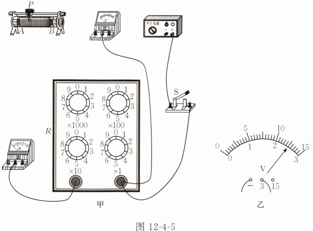 (选填“左”或“右”)端。(3)小明控制电阻箱接入电路的阻值R=5Ω一定,调节滑动变阻器的滑动头P,进行了5次实验,测得了如下表所示的数据,其中第4次实验时,电压表的指针偏转情况如图12-4-5乙所示,其示数为
