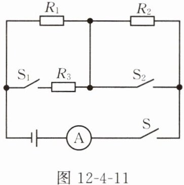 3. 如图12-4-11所示,电源电压恒定,定值电阻$R_{1}$的阻值为$20\ {\Omega}$,定值电阻$R_{2}$的阻值为$10\ {\Omega}$。当开关$S$闭合、$S_{1}$和$S_{2}$断开时,电流表的示数为$0.5\ {A}$,则电源电压是