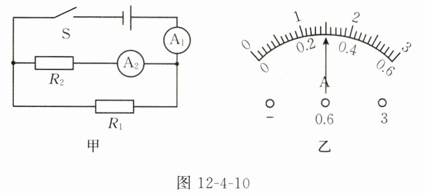 2. 如图12-4-10甲所示,定值电阻$R_{2}$的阻值为$40\ {\Omega}$,闭合开关$S$,电流表$A_{1}$、$A_{2}$的指针偏转情况均如图12-4-10乙所示,则定值电阻$R_{1}$的阻值为