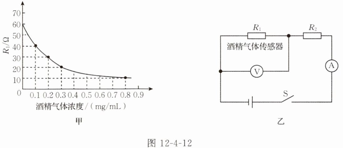 4. 有一种由酒精气体传感器制成的呼气酒精测试仪,当它接触的酒精气体浓度增加时它的阻值降低(如图12-4-12甲所示),当酒精气体的浓度为$0$时,其阻值为$60\ {\Omega}$。将其接入如图12-4-12乙所示的工作电路中,电源电压恒为$12\ {V}$,定值电阻$R_{2}=20\ {\Omega}$。