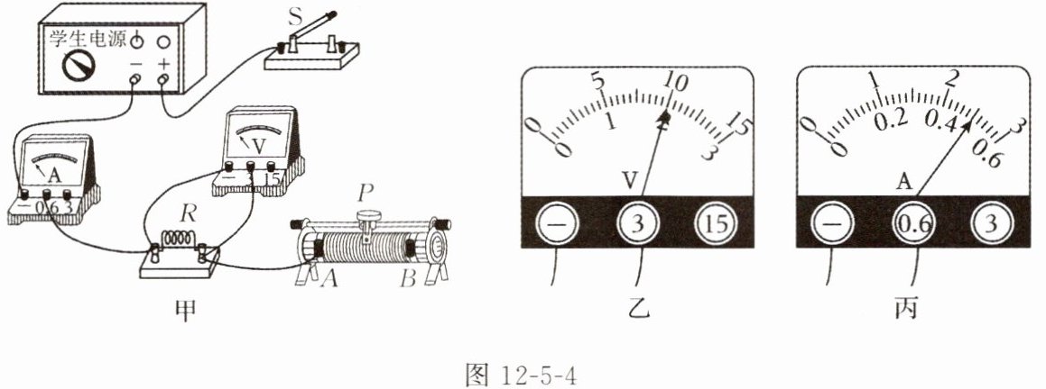 。(4)上述故障解决后,闭合开关S,调节滑动变阻器的滑动头$P$至某位置,观察到电压表和电流表的示数分别如图12-5-4乙、丙所示,则电压表的示数为