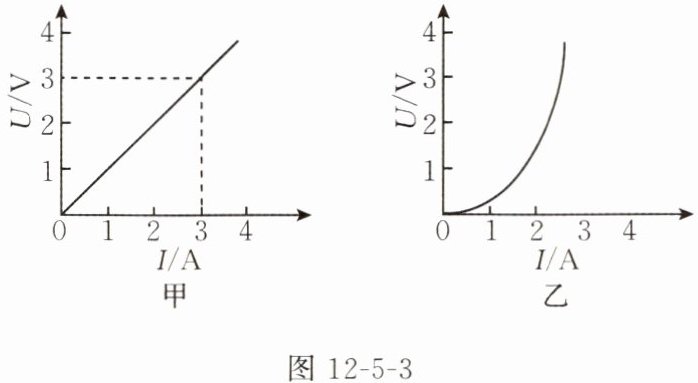 2. (多选)在“伏安法测电阻”实验中,有两位同学分别选择定值电阻和小灯泡为测量对象,在处理实验数据时,绘制了定值电阻和小灯泡的$U-I$图像,分别如图12-5-3甲、乙所示,则下列说法错误的是(