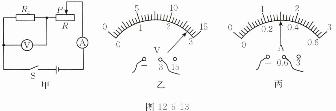 (1)小明的设计方案如图12-5-13甲所示,闭合开关S,调节滑动变阻器$R$的滑动头$P$至适当位置,电压表、电流表的示数分别如图12-5-13乙、丙所示,则电压表的示数为