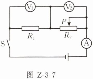 7. 如图 Z-3-7 所示,电源电压 $ U $ 恒定,定值电阻 $ R_1 $ 的阻值为 $ 5 \Omega $,滑动变阻器 $ R_2 $ 的铭牌上标有“$ 10 \Omega \ 2 A $”的字样,电流表的量程为 $ 0 \sim 0.6 A $,两个电压表的量程均为 $ 0 \sim 3 V $。在保证电路中各元件安全的条件下,移动滑动变阻器的滑动头 $ P $,发现两个电压表的示数变化范围均为 $ 1.5 \sim 3 V $。下列判断正确的是(
