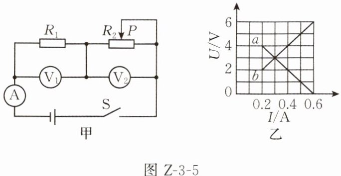 5. 如图 Z-3-5 甲所示,电源电压不变,$ R_1 $ 为定值电阻。闭合开关 $ S $,调节滑动变阻器 $ R_2 $,使其接入电路的阻值从最大到最小,两个电阻的 $ U - I $ 图像如图 Z-3-5 乙所示。下列判断正确的是(