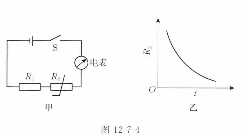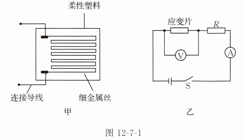 3. (安徽中考)将一根细金属丝置入柔性塑料中,可以制成用来检测物体形变的器件——应变片,其结构如图 12 - 7 - 1 甲所示。将它接入如图 12 - 7 - 1 乙所示的电路中,电源电压不变,R 为定值电阻。闭合开关 S,当应变片随被检测物体发生拉伸形变时,塑料中的细金属丝会被拉长变细,导致电阻变大,则电路中的(