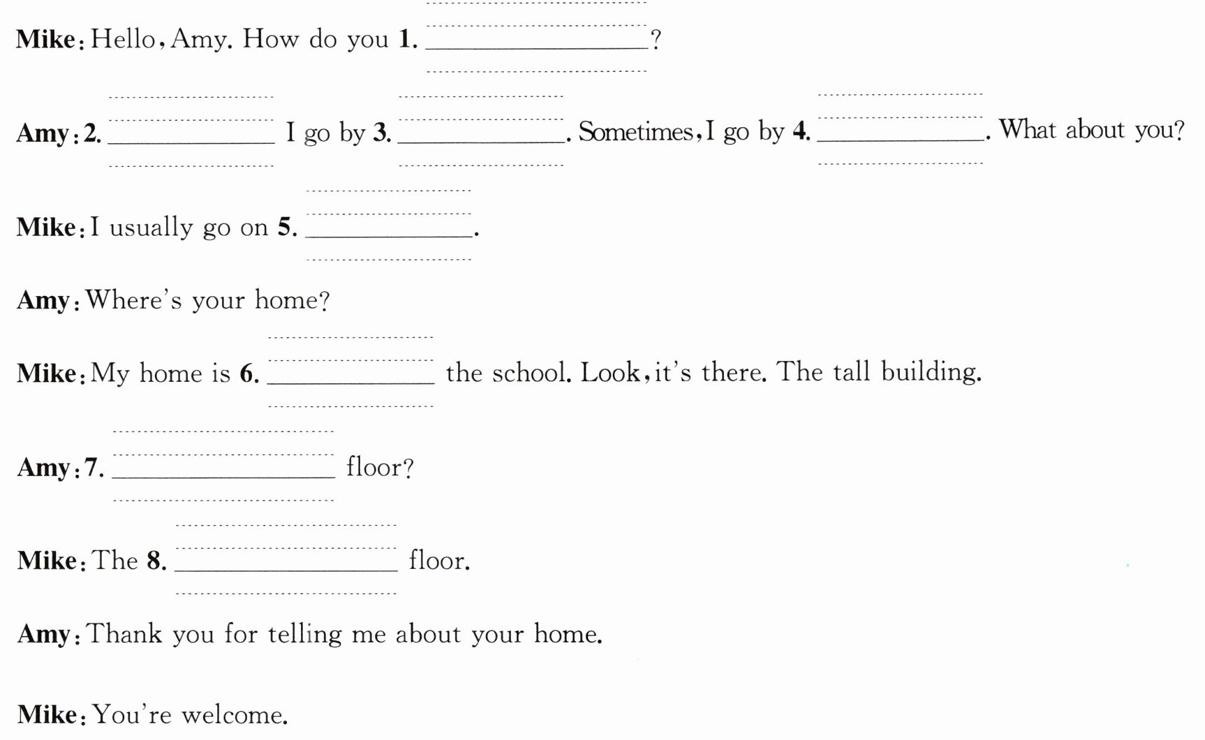 1. go home 2. Usually 3. bike/bus 4. bus/bike 5. foot 6. near 7. Which 8. third