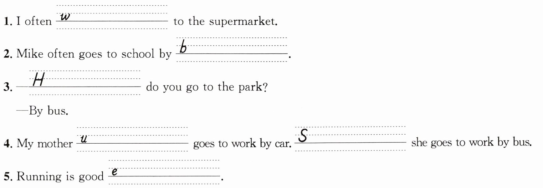 1. walk 2. bus/bike 3. How 4. usually; Sometimes 5. exercise