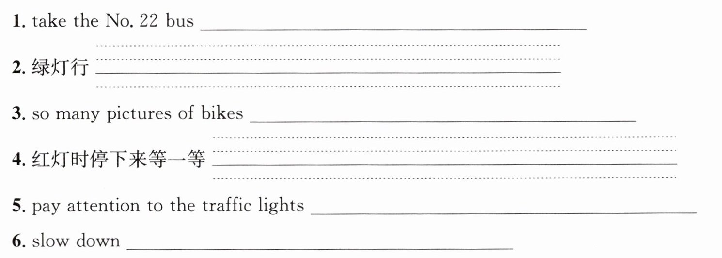 1. 乘坐第 22 路公共汽车 2. go at a green light 3. 这么多自行车的照片 4. stop and wait at a red light 5. 注意交通信号灯 6. 减速;慢下来 7. over there