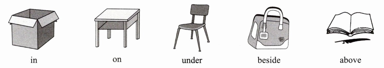 三、以所给图片为参照物,根据图片下的单词提示,画出“球”所在的位置。