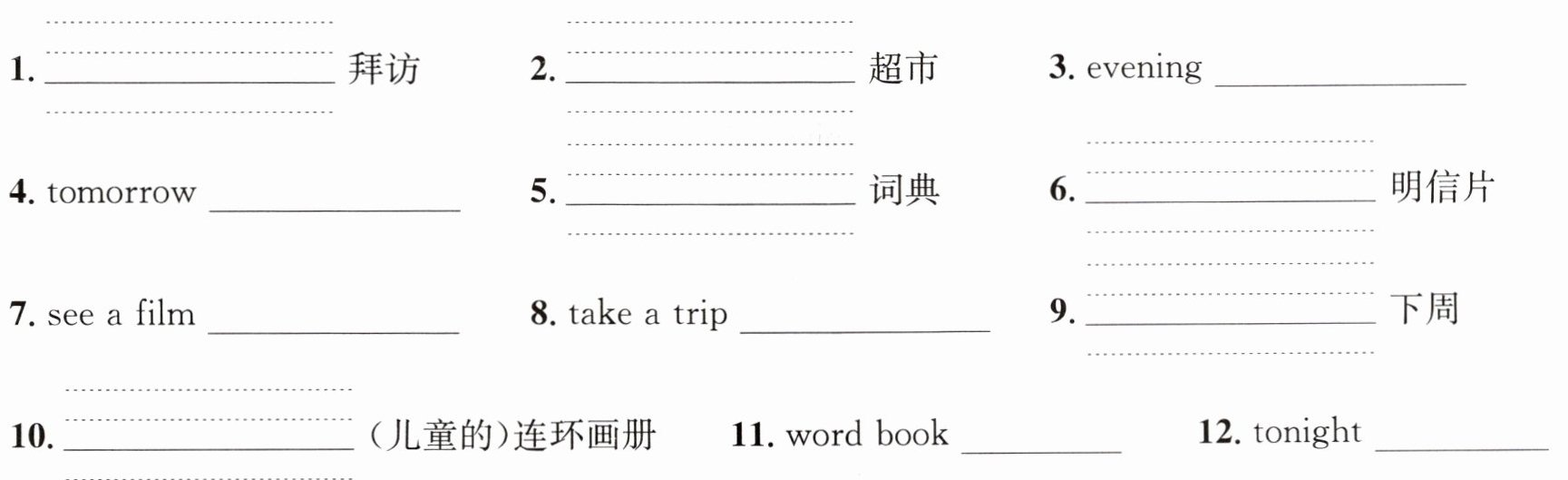 1. visit 2. supermarket 3.晚上;傍晚 4.明天 5. dictionary 6. postcard 7.看电影 8.去旅行 9. next week 10. comic book 11.单词书 12.在今晚