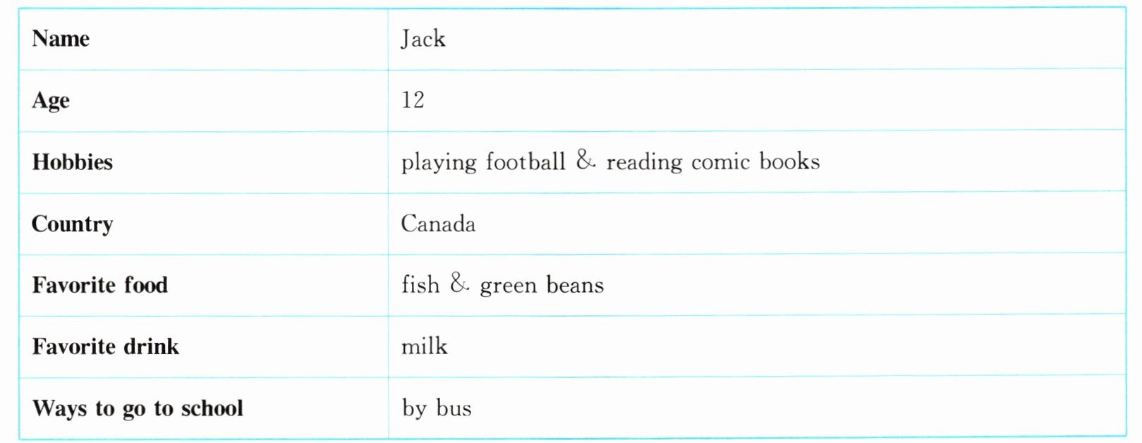 I have a new pen pal. He is a boy. His name is Jack. He is 12. He is from Canada. His favorite food is fish and green beans. And his favorite drink is milk. He likes playing football and reading comic books. His school is far from his home. He goes to school by bus. This is my new pen pal. Do you like him?