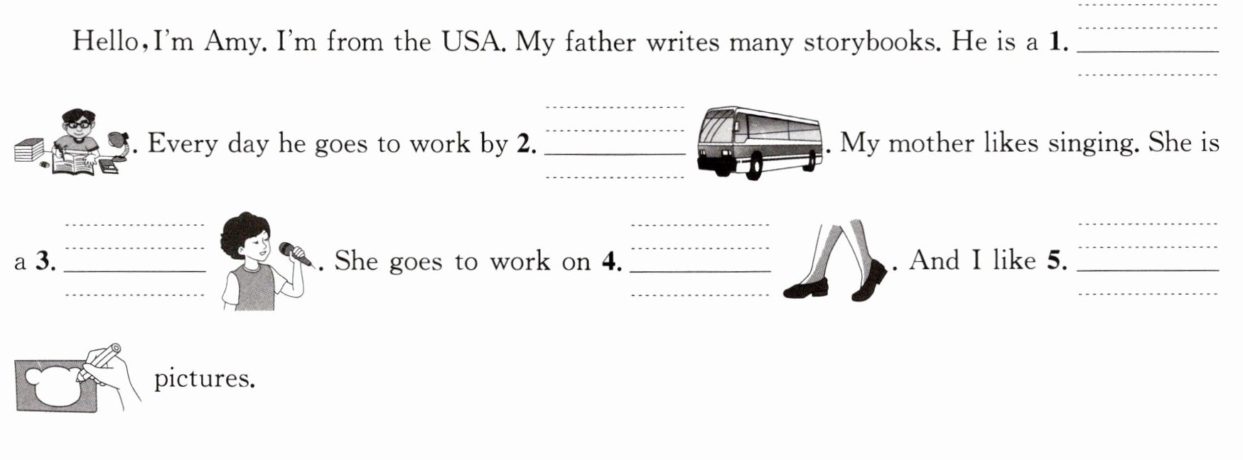 1. writer 2. bus 3. singer 4. foot 5. drawing