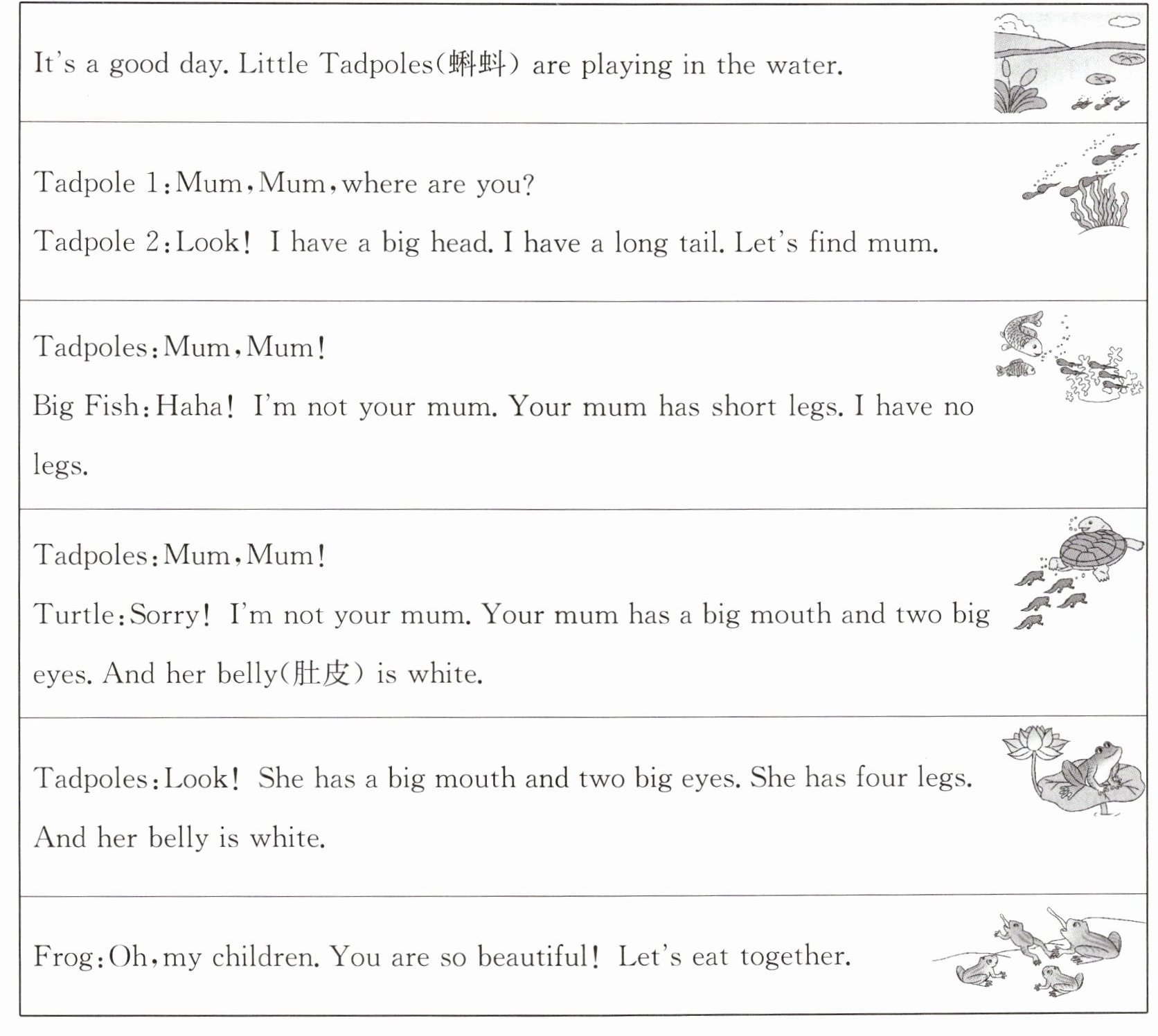 3. F 解析:题干意为:乌龟有白肚皮。由绘本“... and two big eyes. And her belly is white.”可知,小蝌蚪妈妈的肚皮是白色的。