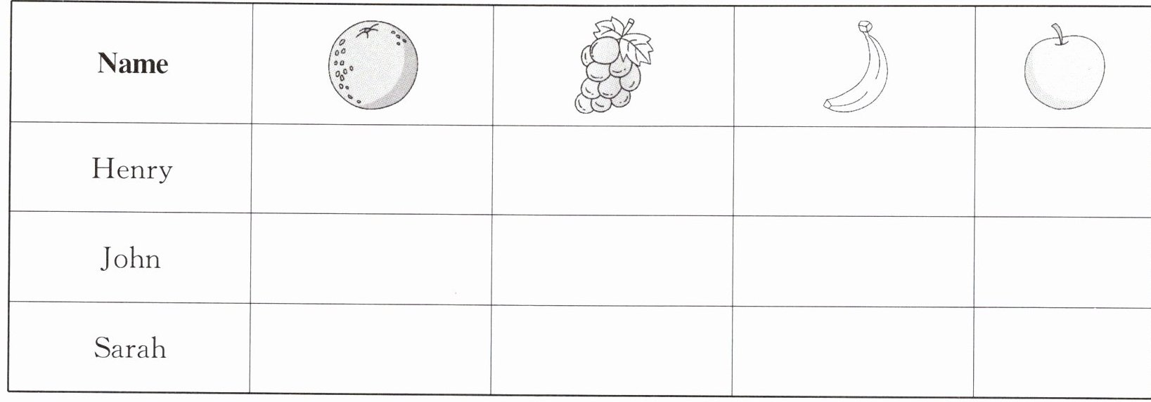 I'm Henry. I have two friends. They are John and Sarah. John likes grapes and oranges. Sarah likes oranges and apples. What about me? I like apples and bananas.