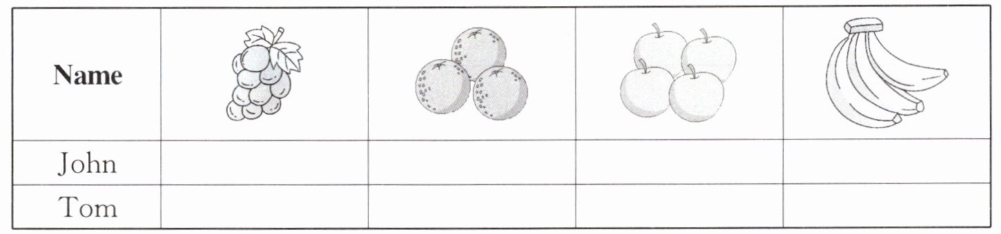 四、听录音,在表格中用“√”标出 John 和 Tom 喜欢的水果。