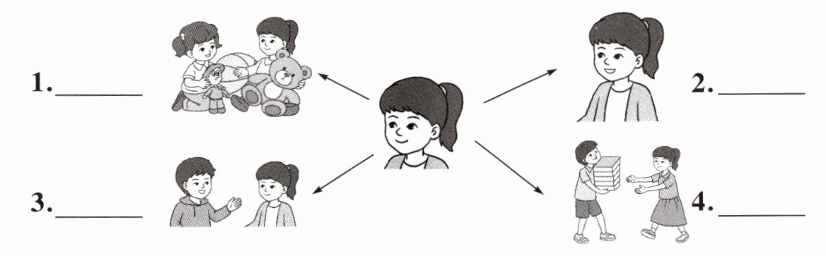 1. D 解析:根据图片可知是女孩在与别人分享玩具,"I share."意为"我分享。"故选D项。2. A 解析:根据图片可知是女孩在微笑,"I smile."意为"我微笑。"故选A项。3. C 解析:根据图片可知是女孩在听别人讲话,"I listen."意为"我倾听。"故选C项。4. B 解析:根据图片可知是女孩在帮忙,"I help."意为"我帮忙。"故选B项。