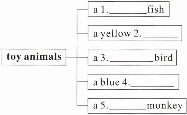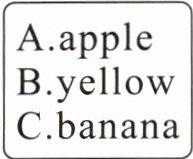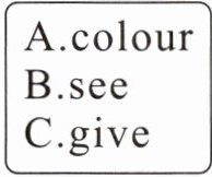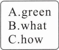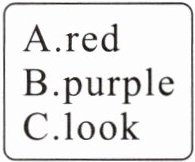 1. B 解析:orange 意为“橙色的”;make 意为“使出现;做”;blue 意为“蓝色的”。orange 与 blue 是颜色类形容词,make 为动词,故选 B 项。2. C 解析:red 意为“红色;红色的”;purple 意为“紫色;紫色的”;look 意为“看”;A、B 选项为颜色类形容词,C 为动词,故选 C 项。3. A 解析:colour 意为“颜色”;see 意为“看见”;give 意为“给”,A 选项为名词,B、C 选项为动词。故选 A 项。4. B 解析:apple 意为“苹果”;yellow 意为“黄色的”;banana 意为“香蕉”,apple 和 banana 是水果,yellow 是表示颜色的形容词。故选 B 项。5. A 解析:green 意为“绿色”;what 意为“什么”;how 意为“如何;怎样”。what 与 how 都是疑问词,用来引导特殊疑问句。green 是表示颜色的形容词。故选 A 项。