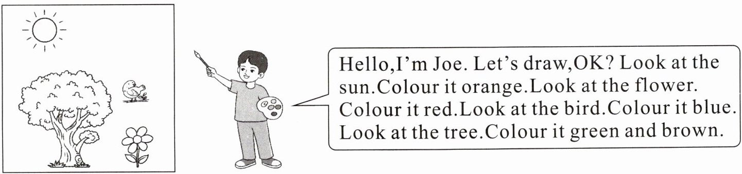 太阳涂成橙色,花涂成红色,鸟涂成蓝色,树涂成绿色和棕色。解析:由描述“Look at the sun. Colour it orange.”可知,太阳是橙色的,由“Look at the flower. Colour it red.”可知,花是红色的。由“Look at the bird. Colour it blue.”可知,鸟是蓝色的。由“Look at the tree. Colour it green and brown.”可知,树干是棕色的,树叶是绿色的。