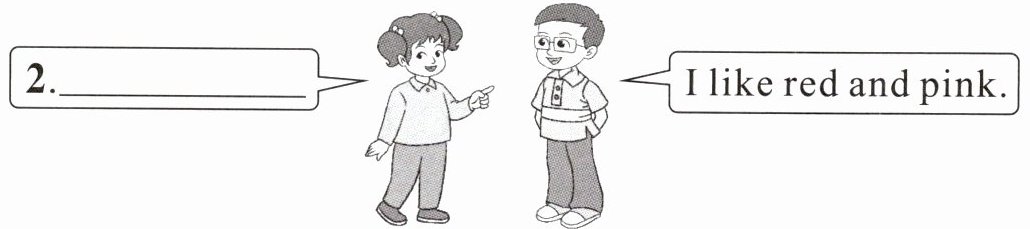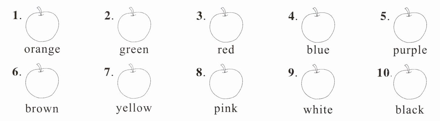我学会了表示颜色的英语单词:读一读,根据提示词,给小苹果涂颜色。