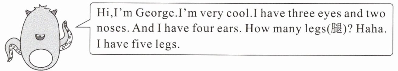 Hi, I'm George. I'm very cool. I have three eyes and two noses. And I have four ears. How many legs(腿)? Haha. I have five legs.