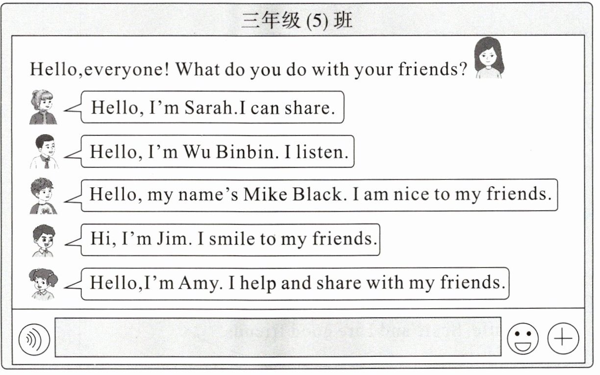 1. B 解析:由对话“Hello,I'm Sarah. I can share.”可知,Sarah 可以和朋友一起分享。2. C 解析:由对话“Hello,I'm Wu Binbin. I listen.”可知,吴斌斌可以倾听。3. E 解析:由对话“Hello, my name's Mike Black. I am nice to my friends.”可知,迈克对朋友们很友好。4. D 解析:由对话“Hi,I'm Jim. I smile to my friends.”可知,Jim 可以对朋友们微笑。5. A 解析:由对话“Hello,I'm Amy. I help and share with my friends.”可知,埃米能帮助朋友并且和朋友一起分享。