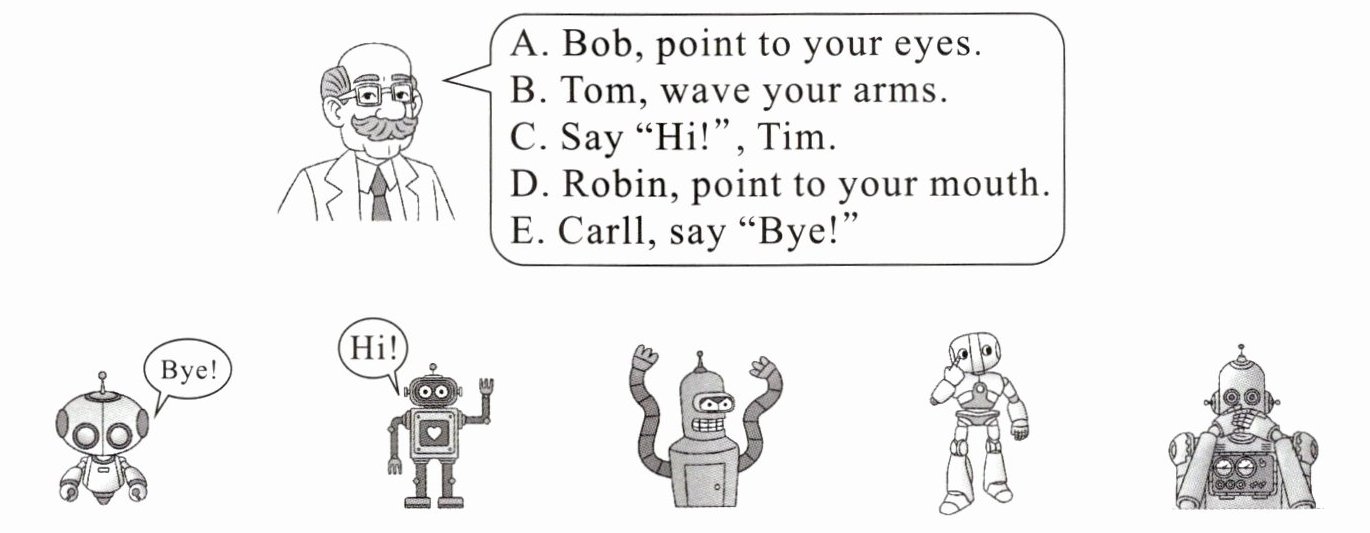1. E; Carll 解析:E 选项意为“卡尔,说‘再见!’。”与图片相符。机器人的名字是 Carll。2. C; Tim 解析:C 选项意为“蒂姆,说‘你好!’。”与图片相符。机器人的名字是 Tim。3. B; Tom 解析:B 选项句意为:“汤姆,挥动你的胳膊。”与图片相符。机器人的名字是 Tom。4. A; Bob 解析:A 选项句意为:“鲍勃,指一下你的眼睛。”与图片中机器人指眼睛的情景相符,机器人名字是 Bob。5. D; Robin 解析:D 选项句意为:“罗宾,指一下你的嘴。”与图片中机器人指着嘴的情景相符,机器人名字是 Robin。